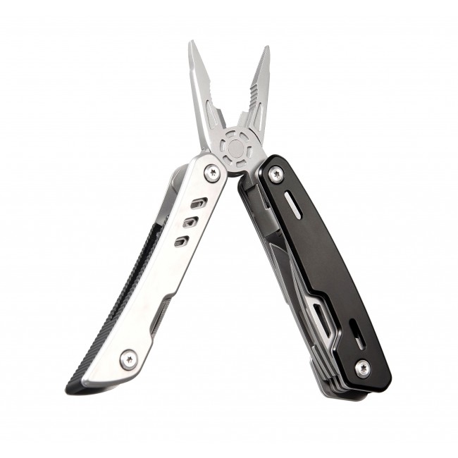 Мультитул на 9 функцій з фіксатором елементів, що відкриваються. Розмір в складеному стані 10,5Х4Х2 см., вага 227 гр., запакований в нейлоновий чохол.